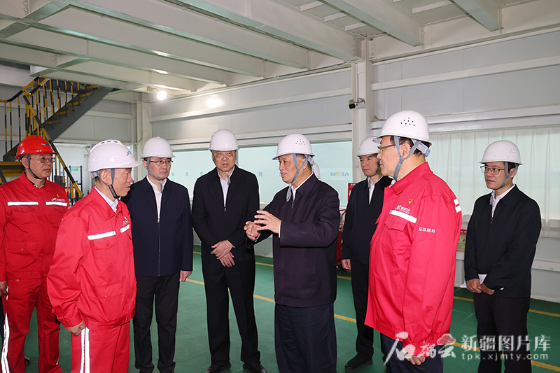5月7日,自治区党委书记马兴瑞在位于米东区的新疆亚欧稀有金属股份有限公司,察看车间生产实况,听取企业经营发展工作介绍。石榴云/新疆日报记者崔志坚摄