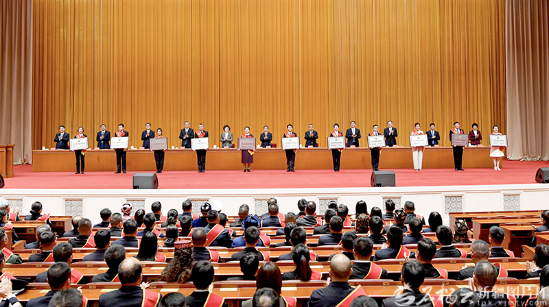 10月16日,自治区党委书记、兵团党委第一书记、第一政委陈小江,自治区党委副书记、自治区主席艾尔肯·吐尼亚孜等领导为荣获模范个人代表颁发荣誉证书和奖章。天山网-新疆日报记者韩亮摄