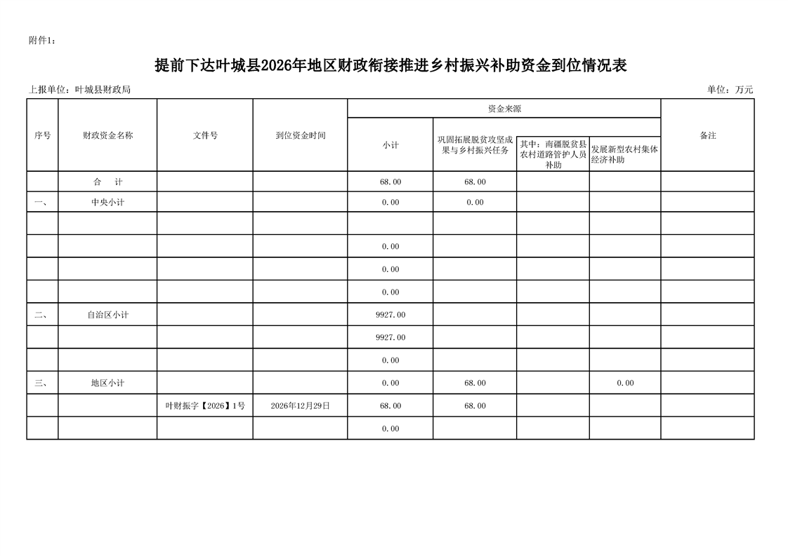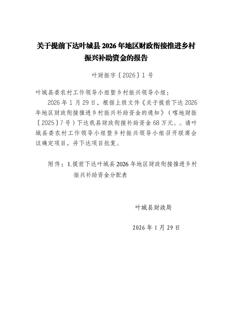 叶财振字[2026]1号 关于提前下达叶城县2026年地区财政衔接推进乡村振兴补助资金的报告-68万元-预告知