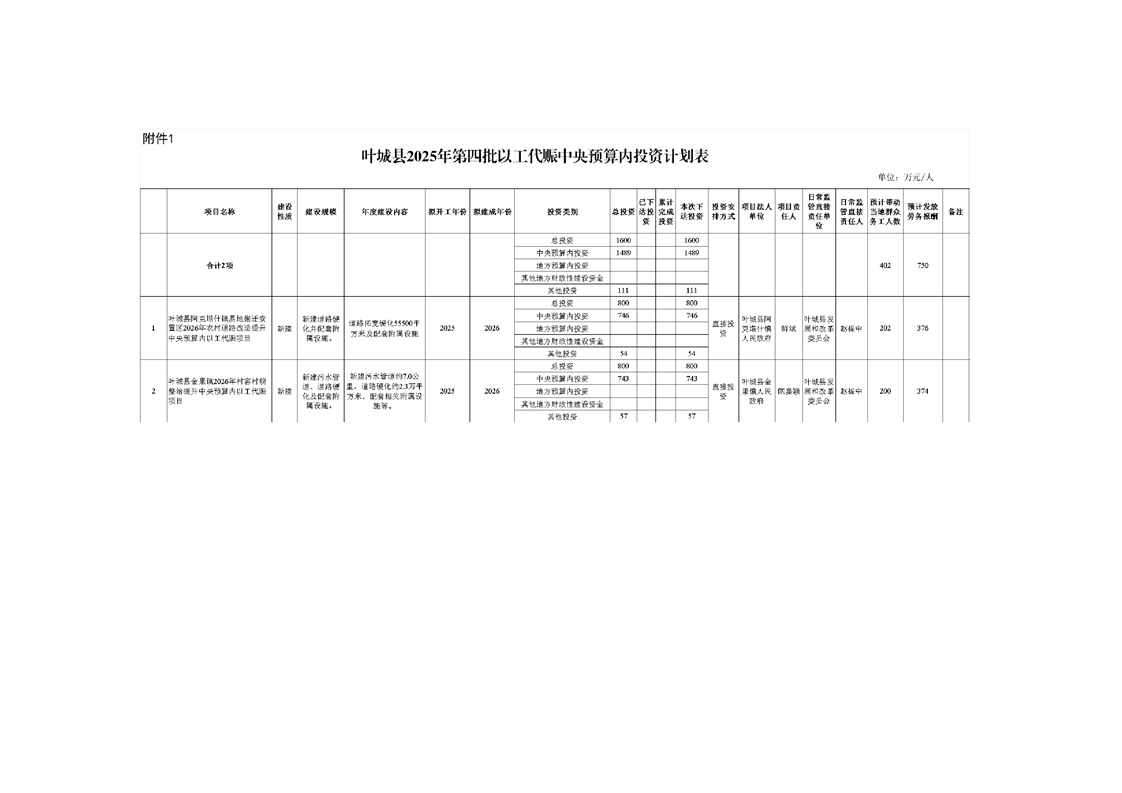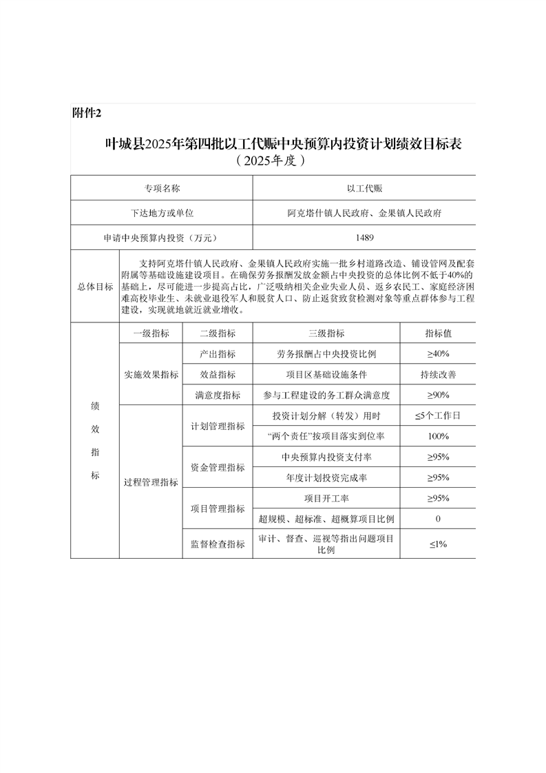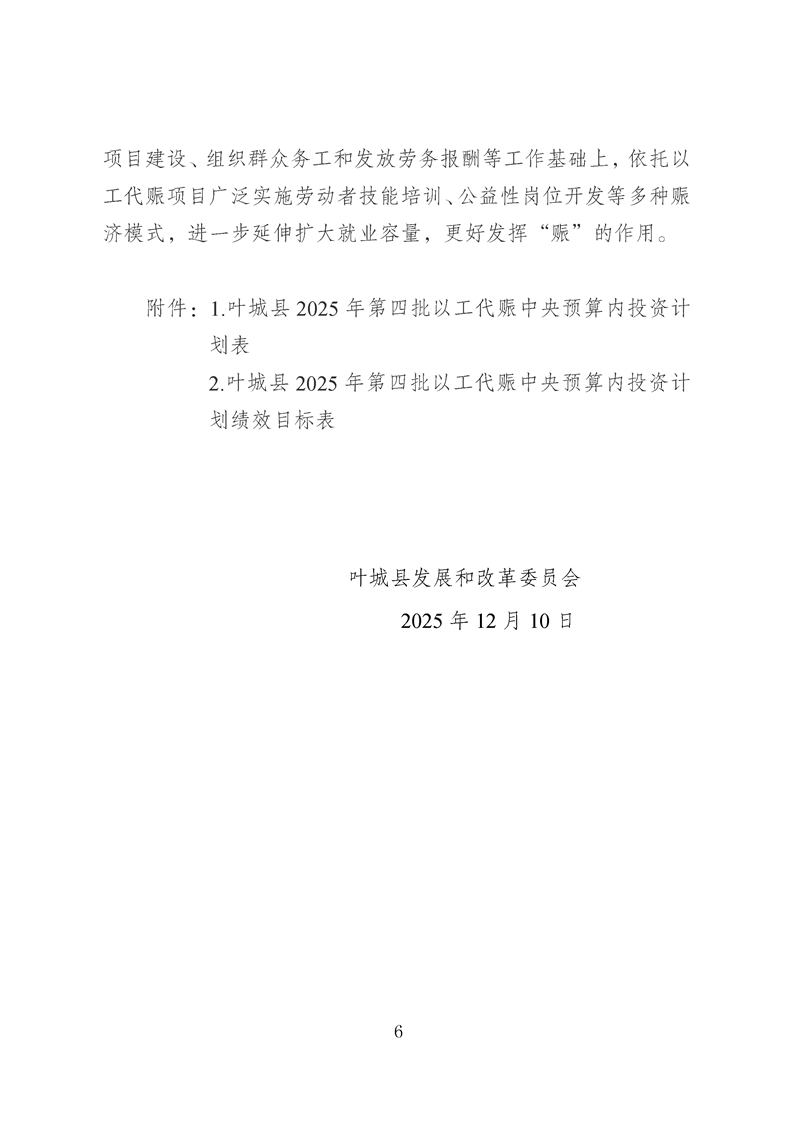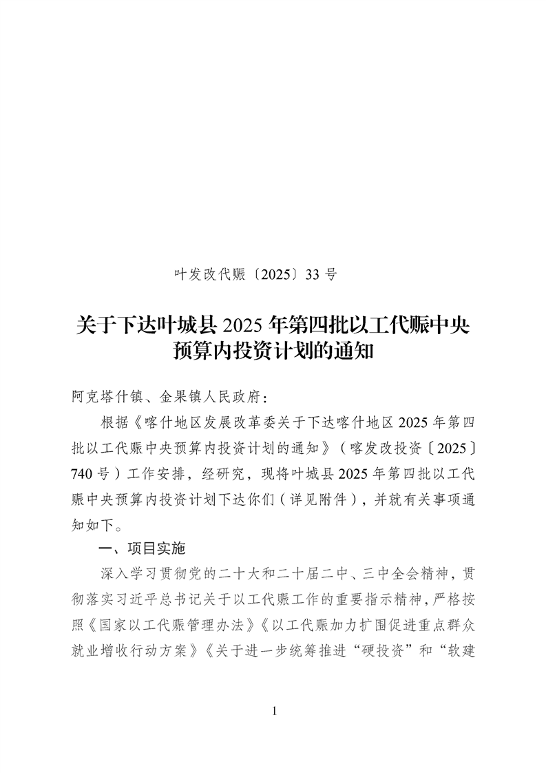叶发改代赈〔2025〕33号 关于下达叶城县2025年第四批以工代赈中央预算内投资计划的通知
