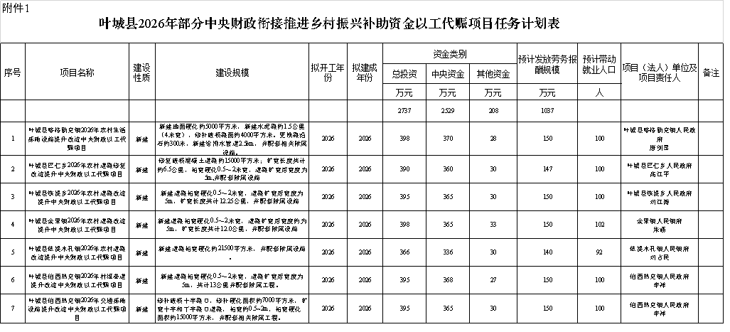 附件:1.叶城县2026年部分中央财政衔接推进乡村振兴补助资金以工代赈项目任务计划表