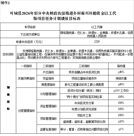 2.叶城县2026年部分中央财政衔接推进乡村振兴补助资金以工代赈项目任务计划绩效目标表