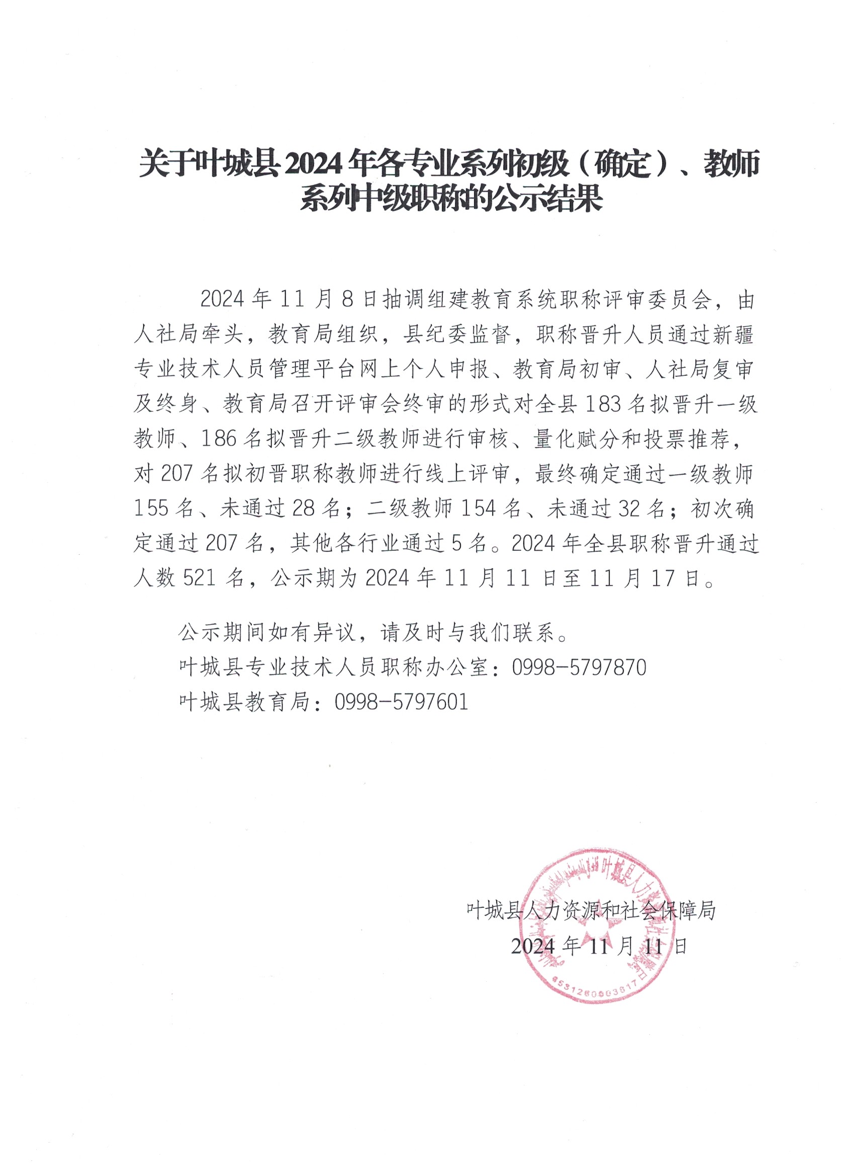 关于叶城县2024年各专业系列初级(确定)、教师系列中级职称的公示结果