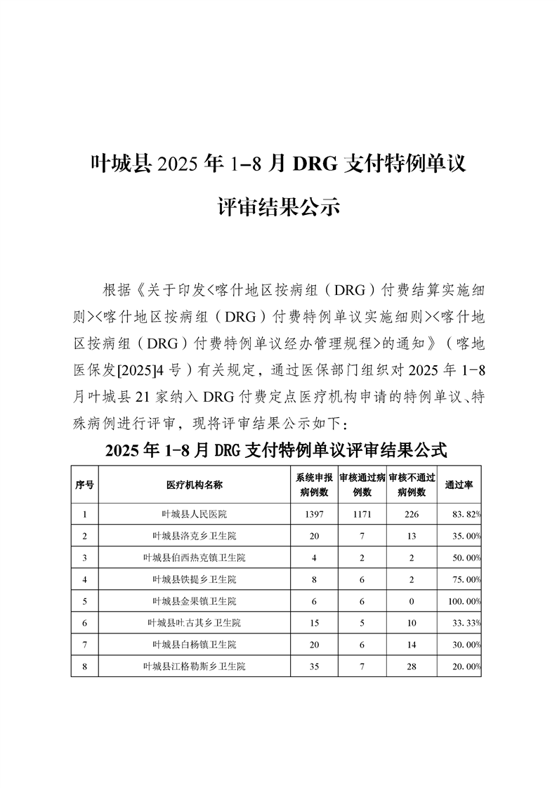叶城县2025年1-8月DRG支付特例单议评审结果公示