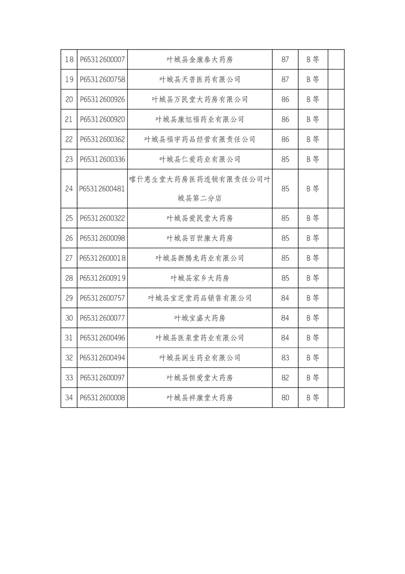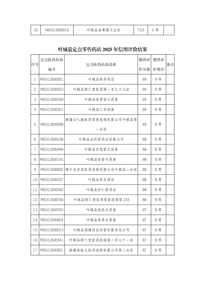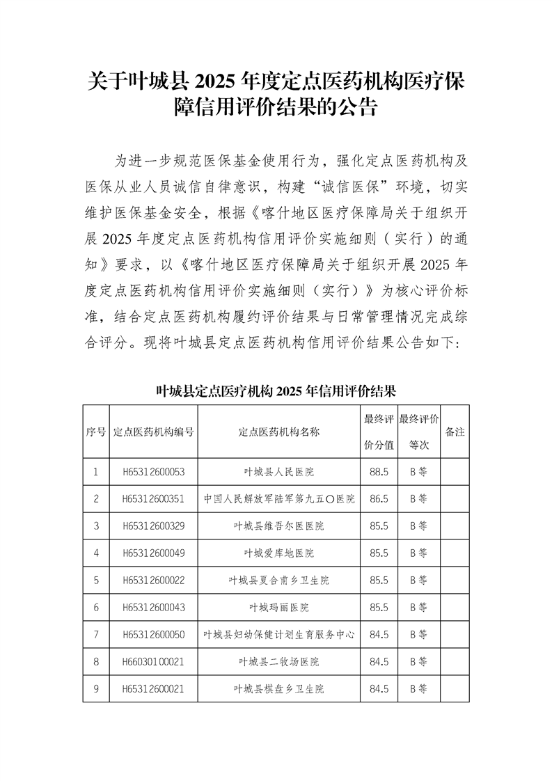 关于叶城县2025年度定点医药机构医疗保障信用评价结果的公告