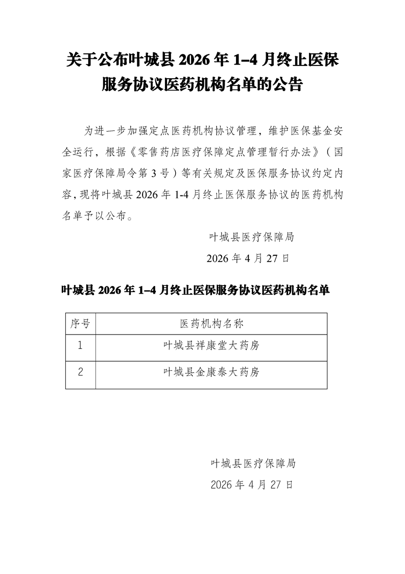 关于公布叶城县2026年1-4月终止医保服务协议医药机构名单的公告