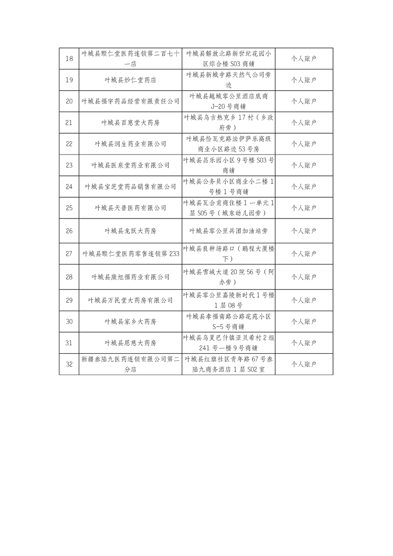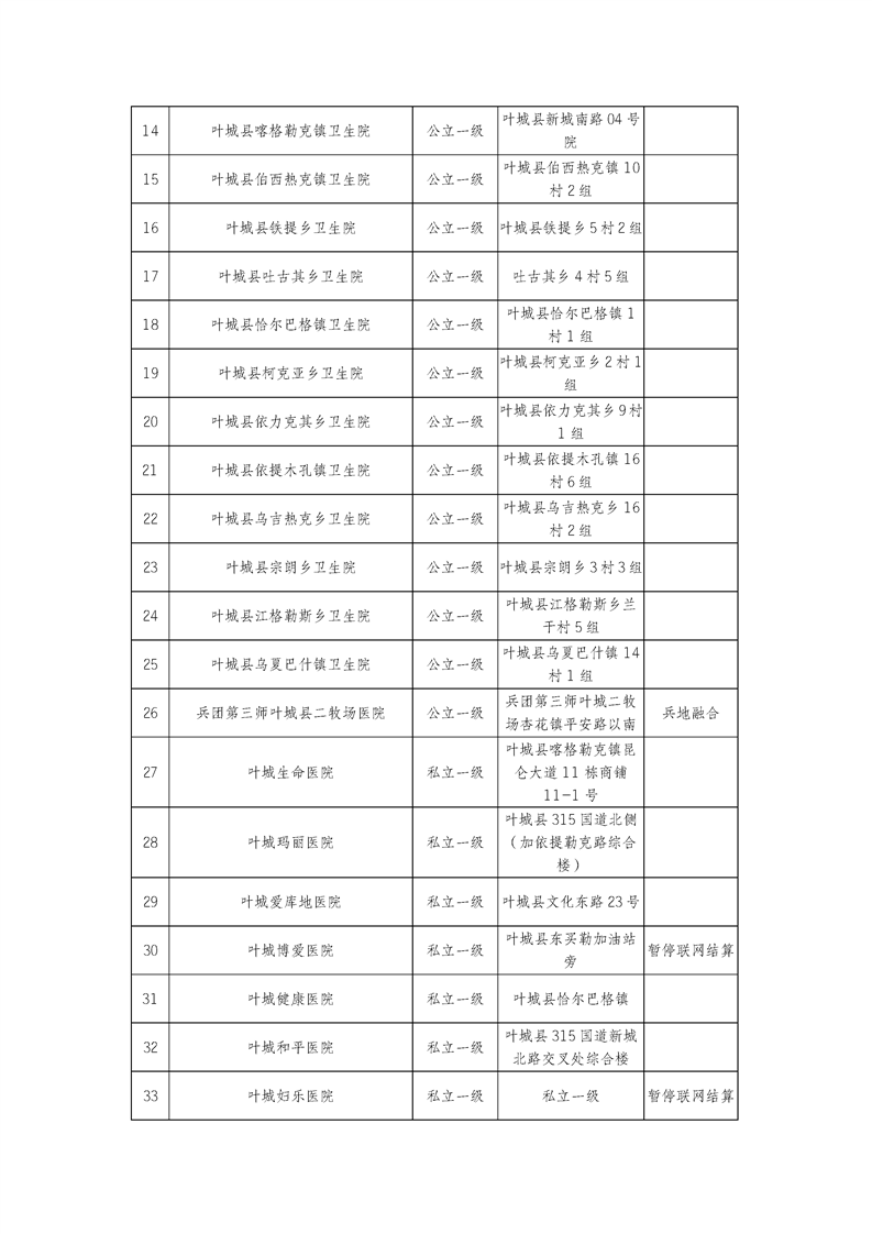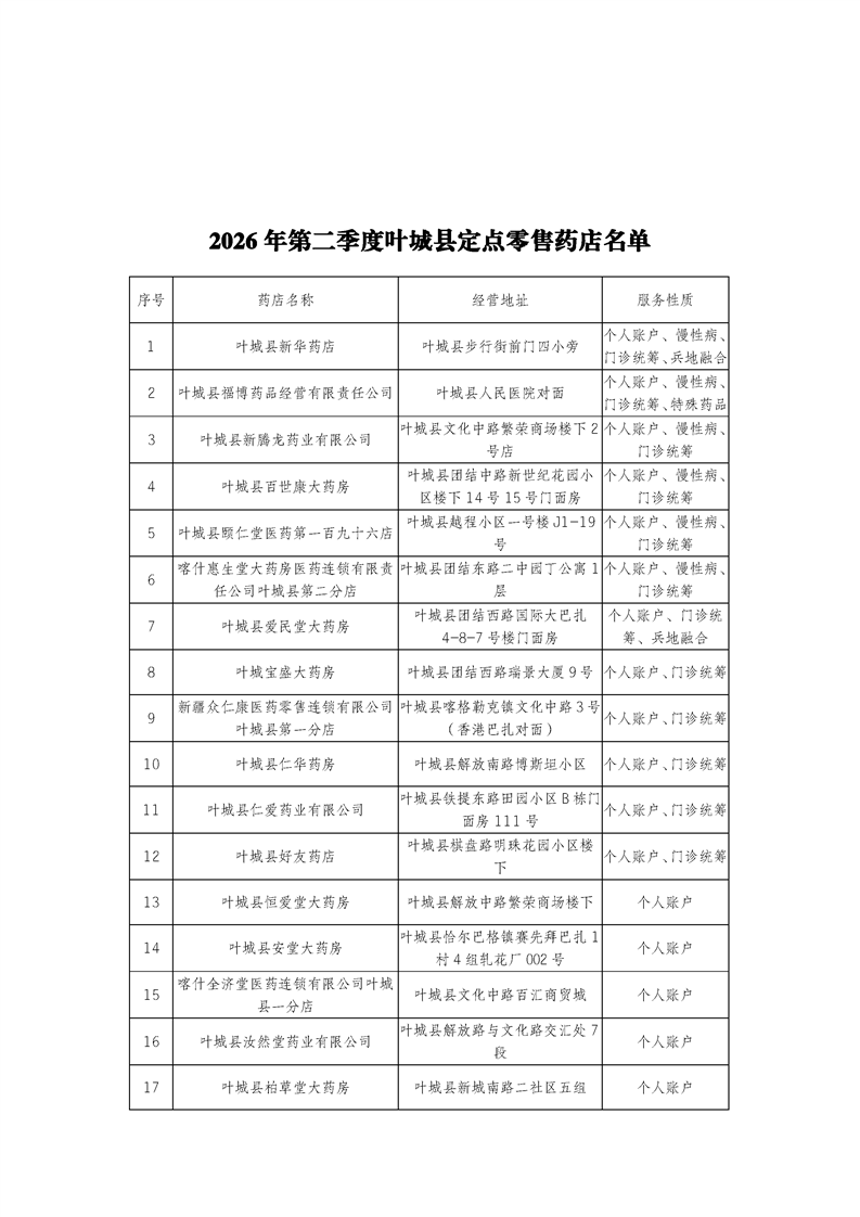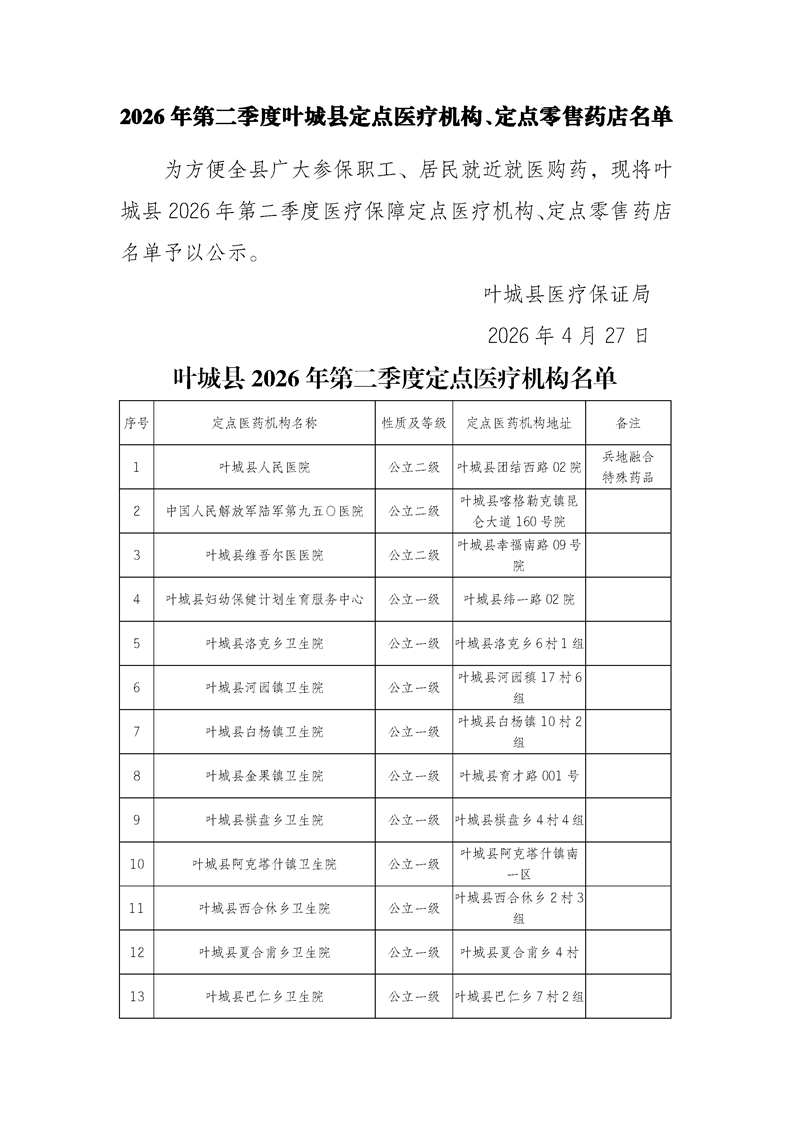 2026年第二季度叶城县定点医疗机构、定点零售药店名单