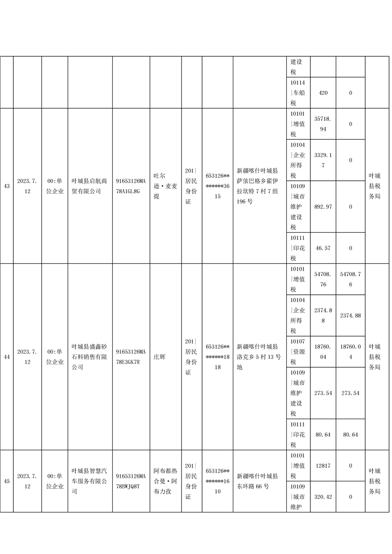 国家税务总局叶城县税务局2023年第二季度欠税公告