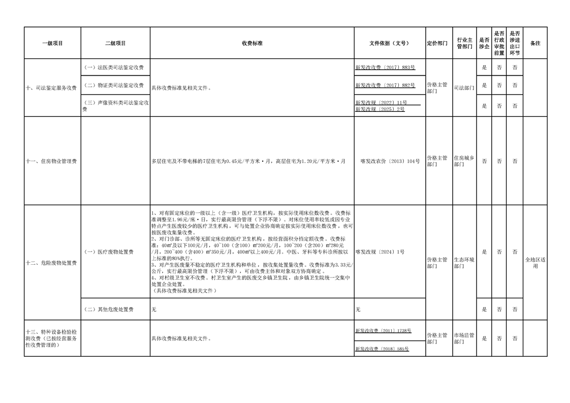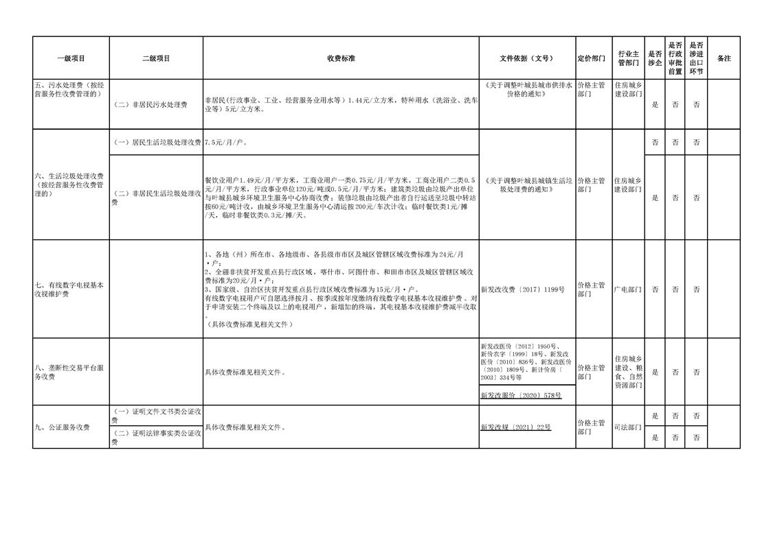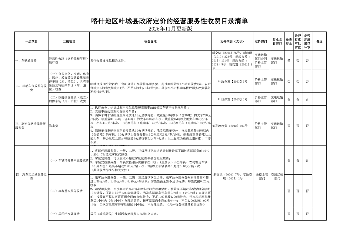 喀什地区叶城县政府定价的经营服务性收费目录清单