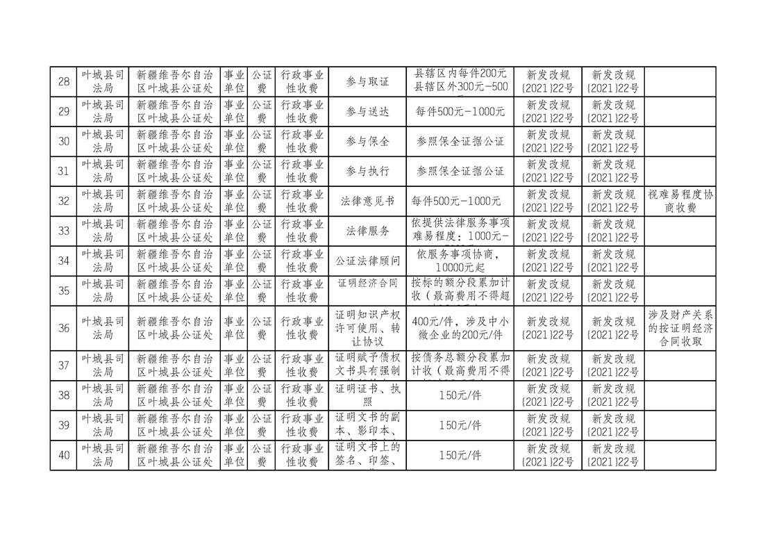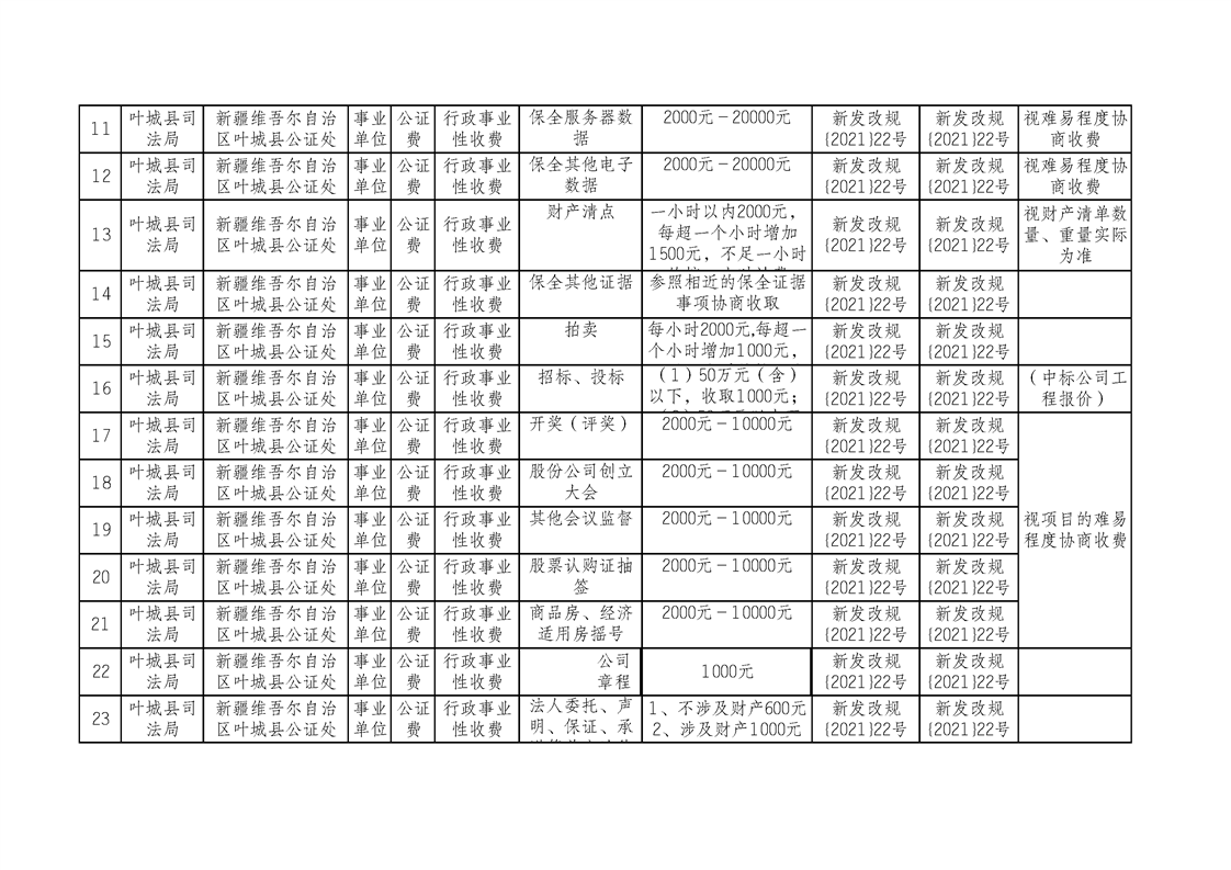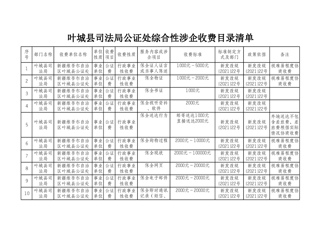 叶城县司法局公证处综合性涉企收费目录清单