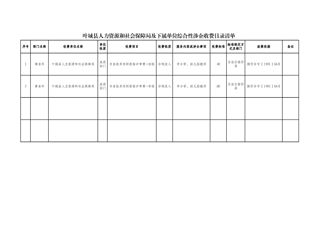 叶城县人力资源和社会保障局及下属单位综合性涉企收费目录清单