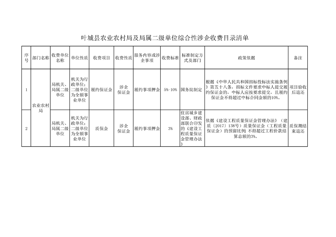 叶城县农业农村局及局属二级单位综合性涉企收费目录清单