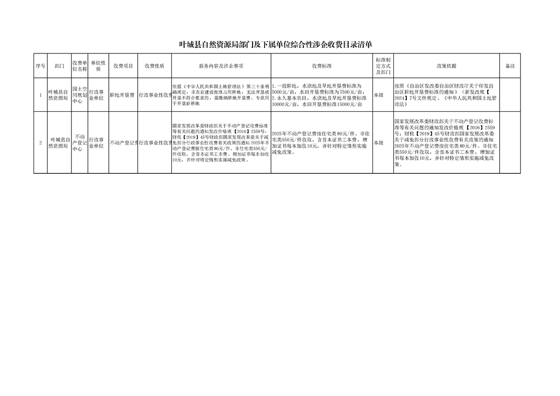 叶城县自然资源局及下属单位综合性涉企收费目录清单