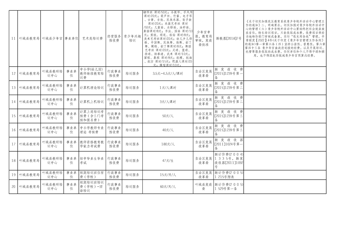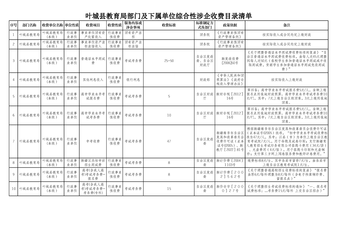 叶城县教育局部门及下属单位综合性涉企收费目录清单