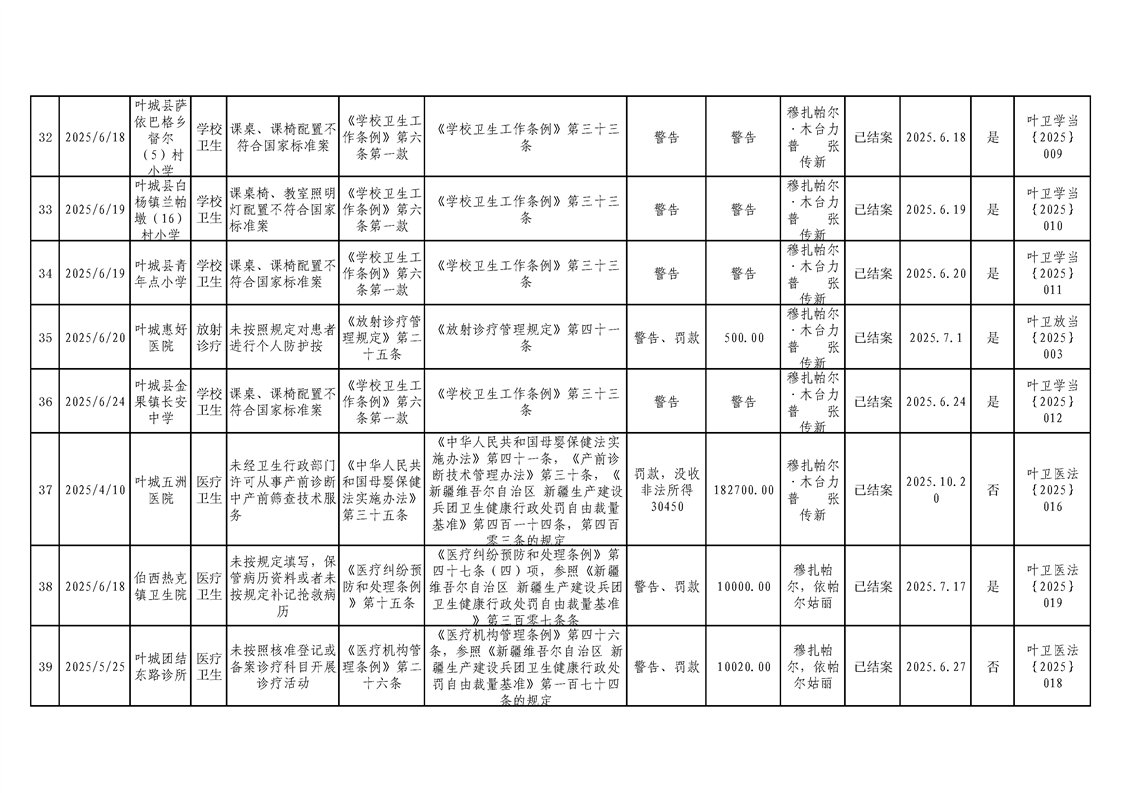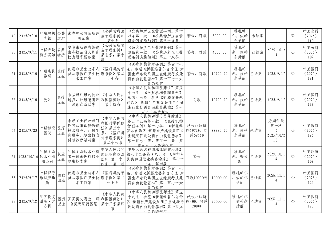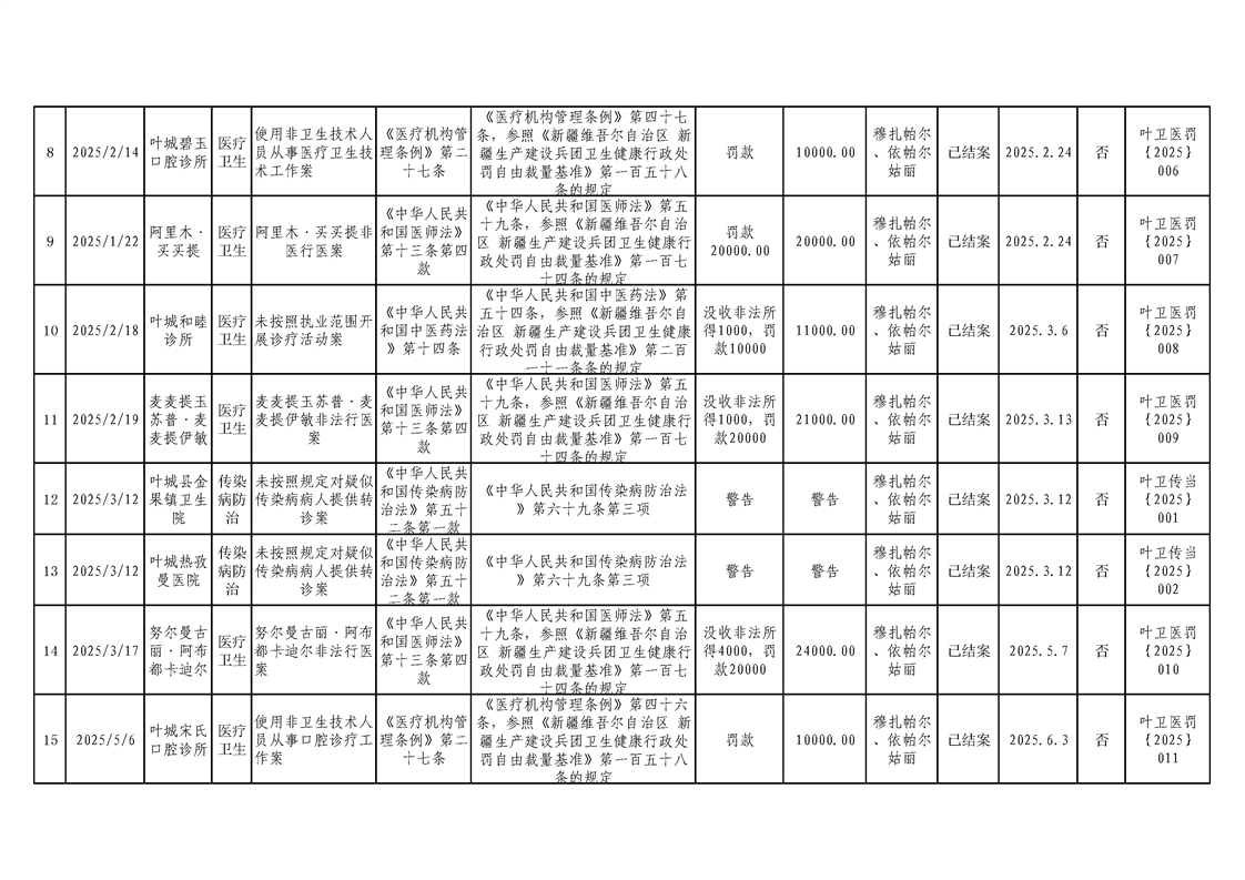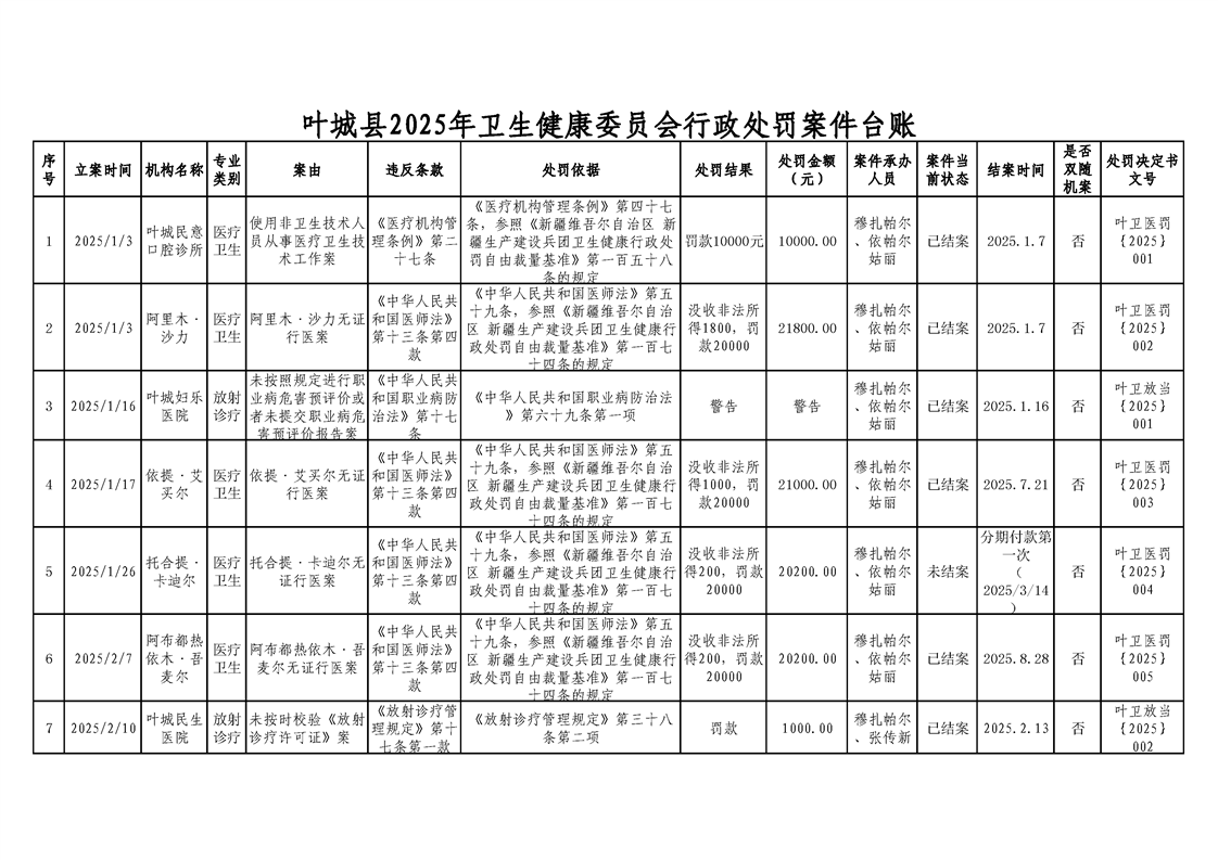 叶城县2025年卫生健康委员会行政处罚案件台账
