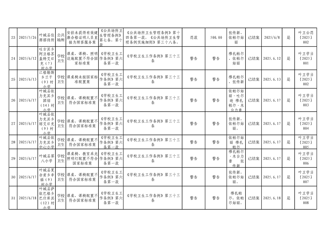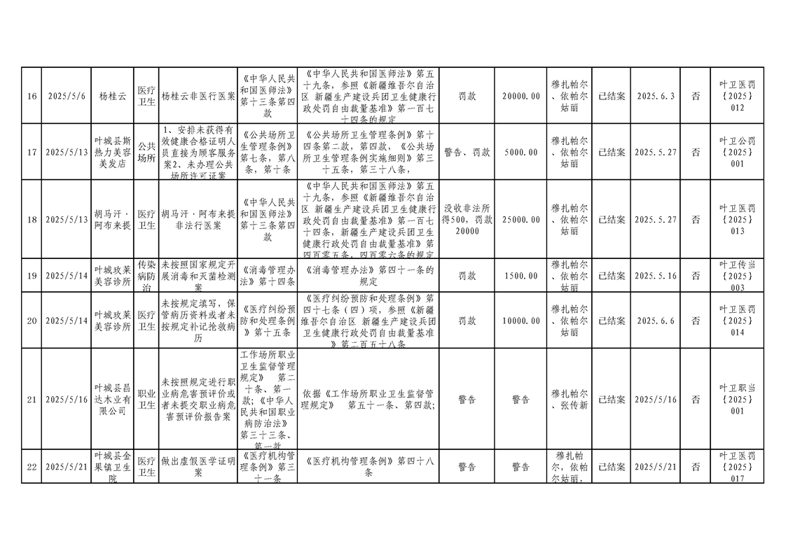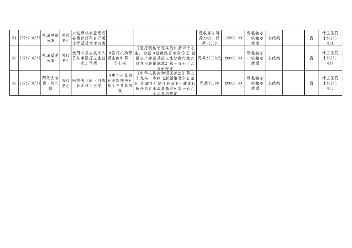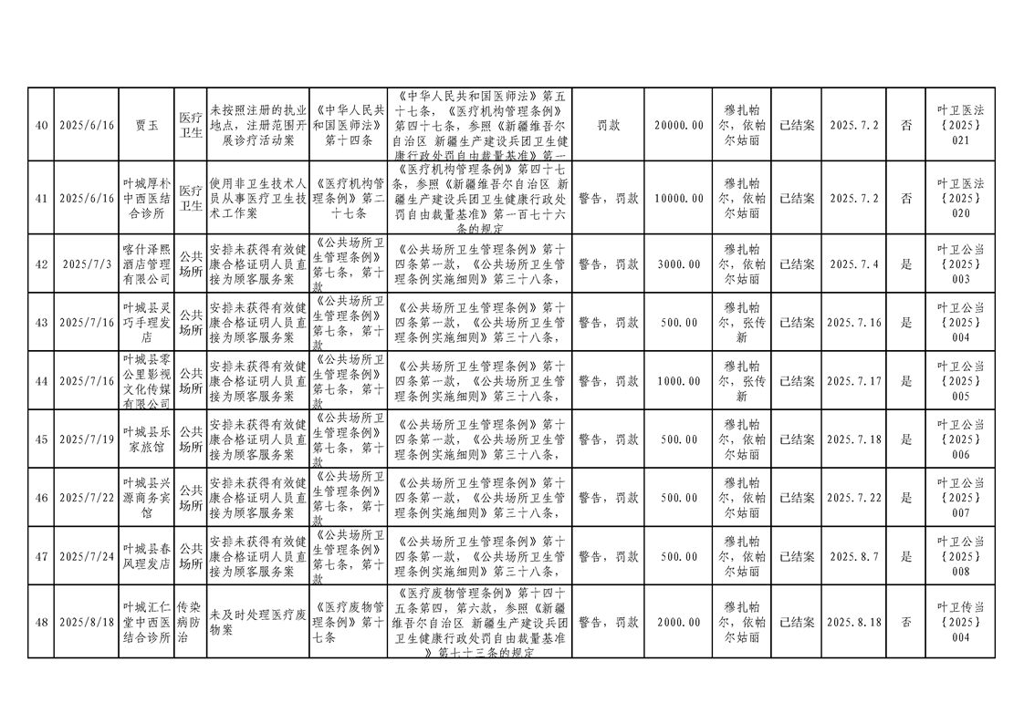 叶城县2025年卫生健康委员会行政处罚案件台账