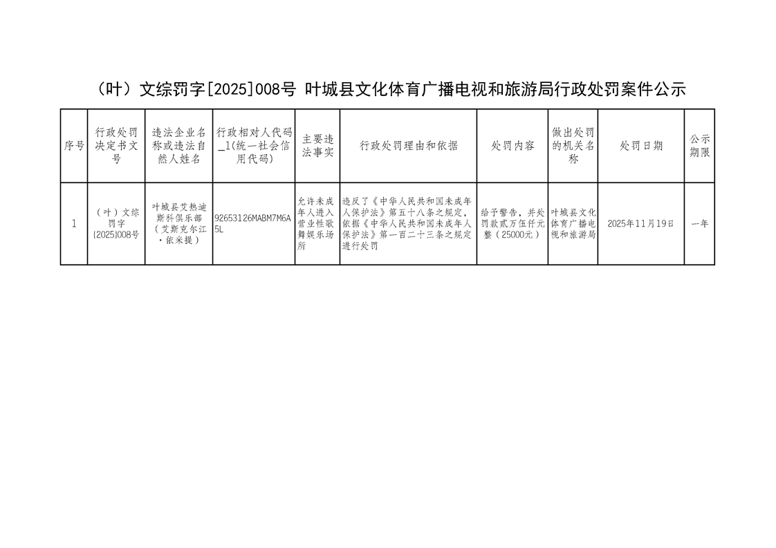 (叶)文综罚字[2025]008号 叶城县文化体育广播电视和旅游局行政处罚案件公示