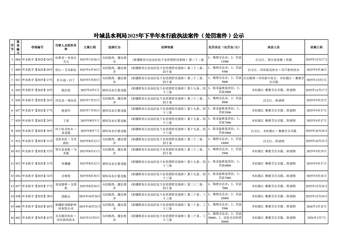 叶城县水利局2025年下半年水行政执法案件(处罚案件)公示
