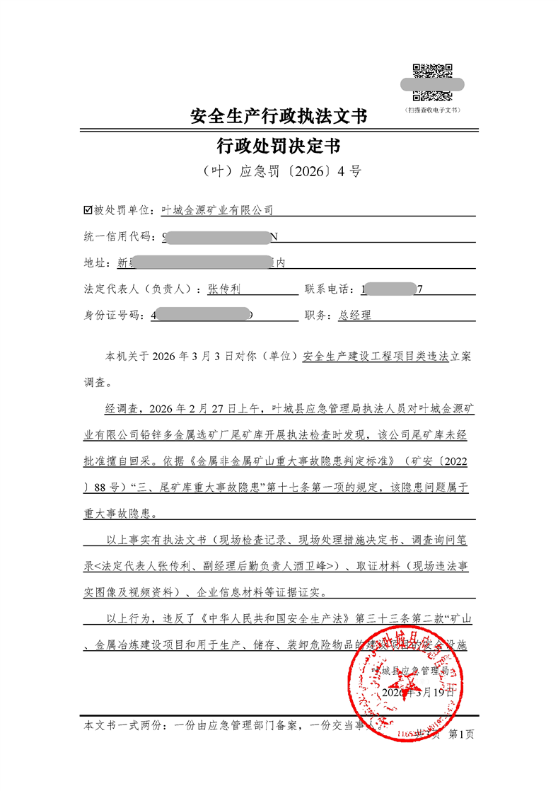 (叶)应急罚〔2026〕4 号 叶城县安全生产行政处罚决定书