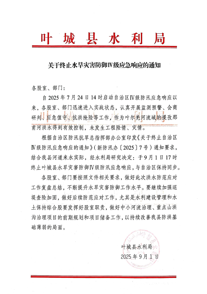 关于终止水旱灾害防御Ⅳ级应急响应的通知