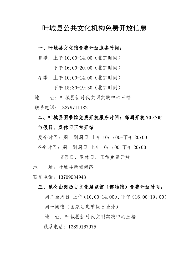 叶城县公共文化机构免费开放信息