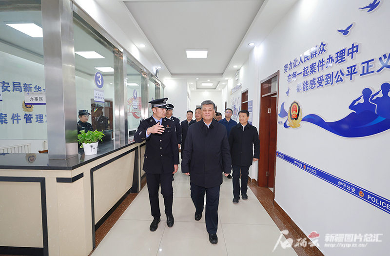 2月25日,自治区党委书记马兴瑞在伊宁市新华东路派出所,了解运行管理和警力优化配置成效。石榴云/新疆日报记者崔志坚摄