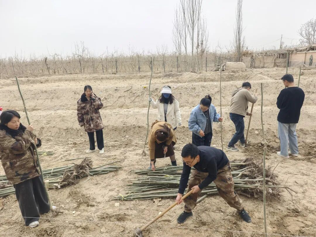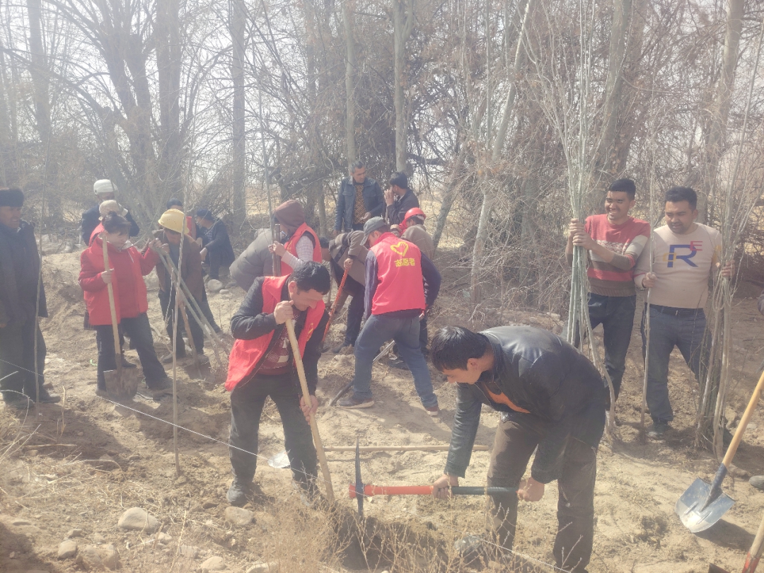 新疆轻工职业技术学院驻依力克其乡夏玛勒巴格村工作队与村“两委”植树现场。