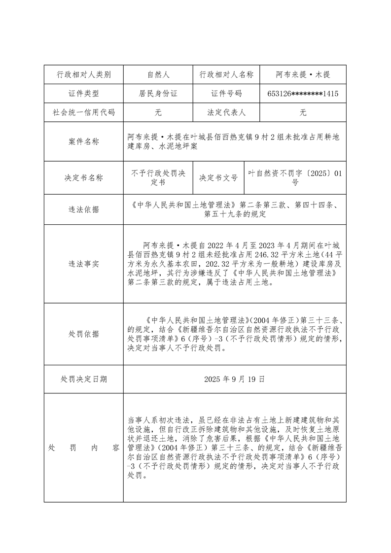 叶自然资不罚字〔2025〕01号 关于阿布来提·木提在叶城县佰西热克镇9村2组未批准占用耕地建库房、水泥地坪案件的行政处罚信息公示