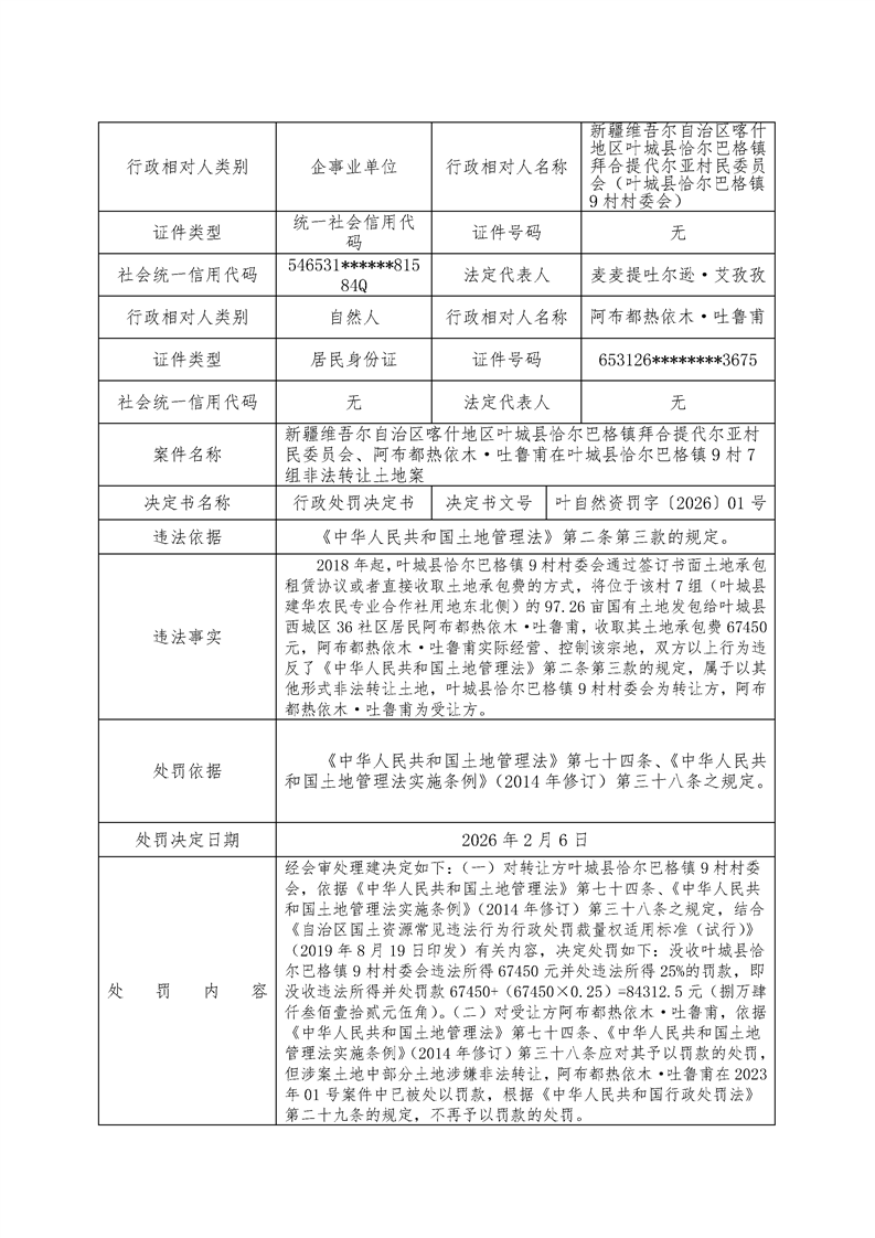 叶自然资罚字〔2026〕01号 关于新疆维吾尔自治区喀什地区叶城县恰尔巴格镇拜合提代尔亚村民委员会、阿布都热依木·吐鲁甫在叶城县恰尔巴格镇9村7组非法转让土地案件的行政处罚信息公示